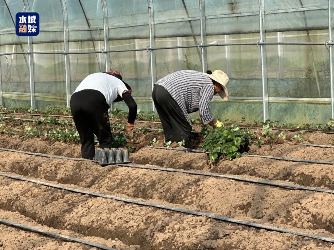 村民赵春菊一边栽苗一边说:“从移栽到后续覆膜,基地常年都有活儿干。在家门口干活,既不耽误照顾家庭,一天还有八九十块钱收入,挺知足的。”